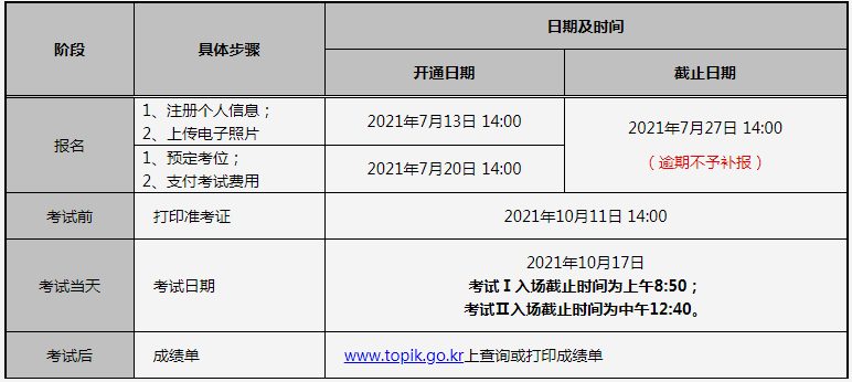 TOPIK网上报名分两个阶段进行。第一阶段考生仅进行个人信息注册和上传电子照片;第二阶段除考生可继续注册外,开放全部考试名额供已完成个人信息注册和上传照片的考生选择,要求考生完成预定考位和支付考费等全部报名手续。